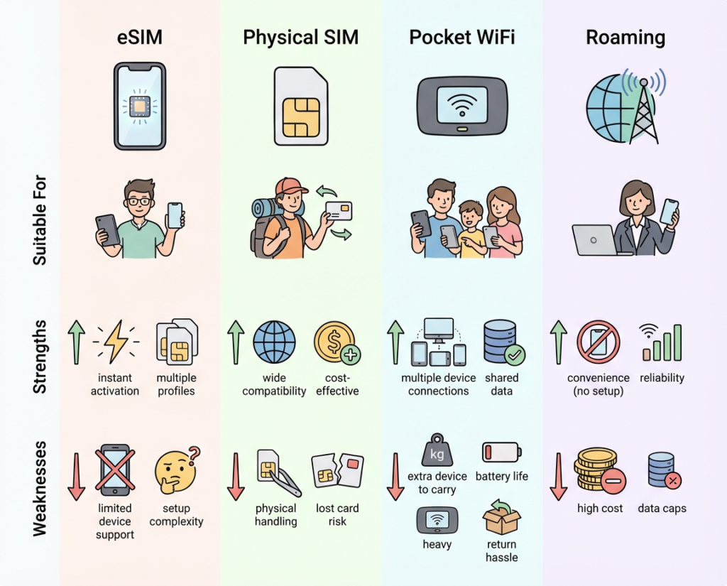 - 不慣れで設定が心配? — YES(物理SIMの店頭購入かローミング) / NO(eSIMで手軽に)