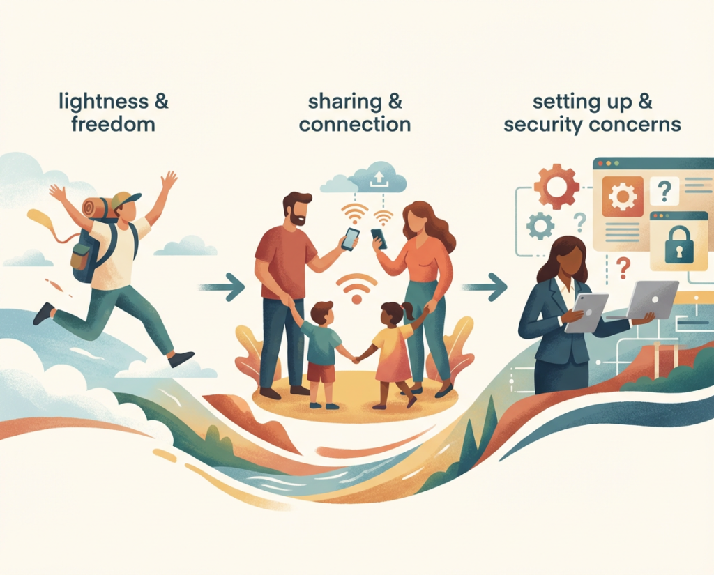 | ポケットWiFi | 家族・グループで使う人 | 複数台同時接続・端末操作は不要 | 重量・充電管理・電波範囲に制限あり | バッテリーと充電ケーブルを余分に持つ・対応周波数を確認 |